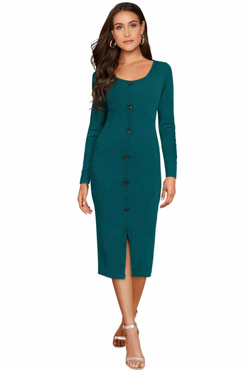 Make a sophisticated style statement with this elegant teal green bodycon midi dress. Designed with a classic round neckline and full-length sleeves, this dress features a button-down front that adds a refined touch. The fitted silhouette enhances your curves, while the front slit ensures comfort and effortless movement. Crafted from soft, stretchable fabric, it is perfect for office wear, casual outings, or evening events. Pair it with heels and minimal accessories for a polished western look.