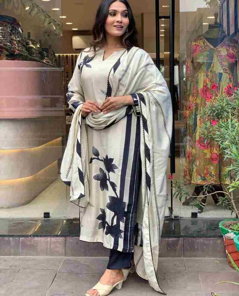 Upgrade your ethnic wardrobe with this sophisticated off white and black floral printed 3-piece suit set, crafted for women who love understated elegance with a modern touch. The set includes a beautifully designed straight kurta, matching solid bottoms, and a graceful printed dupatta that completes the entire look with charm.