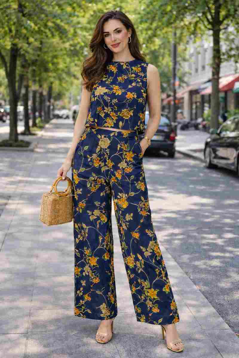 Upgrade your wardrobe with this elegant navy blue floral printed co-ord set featuring a sleeveless top and matching wide-leg palazzo pants.