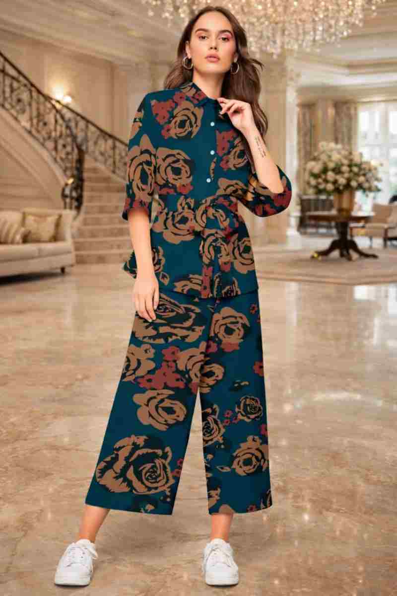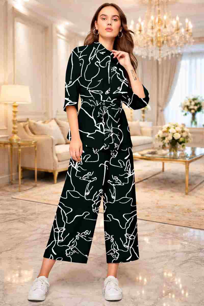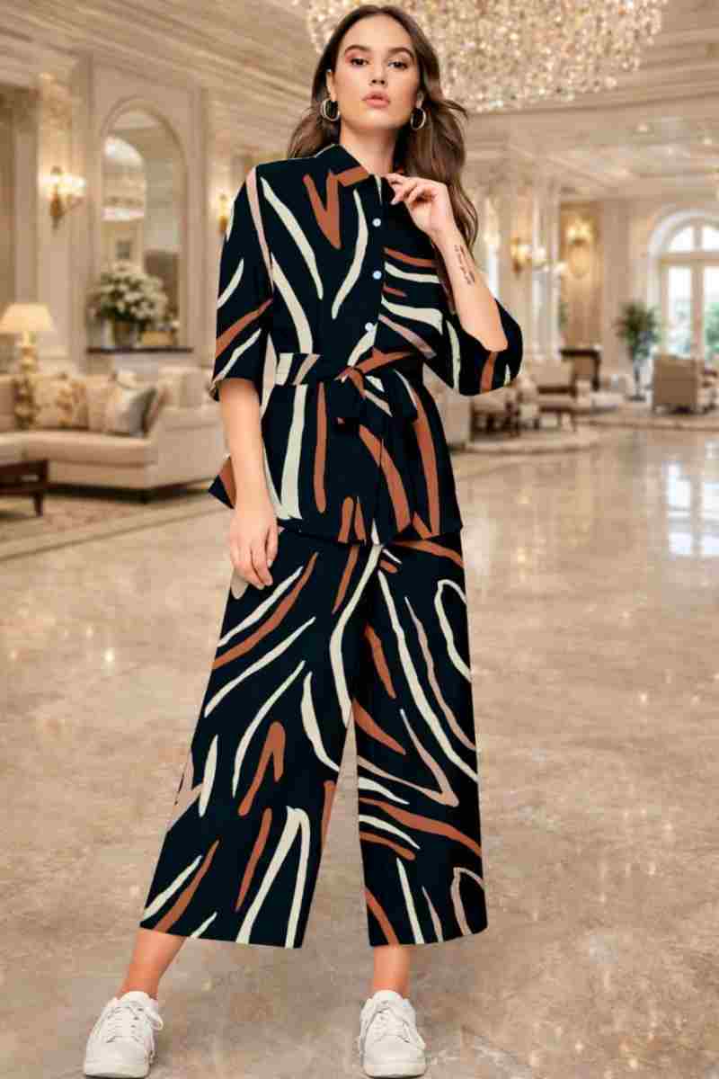 Stylish printed co-ord set featuring a relaxed-fit top and wide-leg pants for effortless everyday elegance.